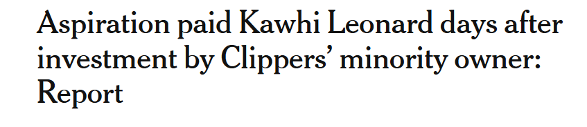 NBA联盟于上周宣布,正就快船队、球队大股东鲍尔默及莱昂纳德展开调查,以确认莱昂纳德与Aspiration的商业合作是否存在规避联盟薪资规则的行为。这一调查源于前Aspiration员工在9月3日Torre的播客节目中提出的指控。