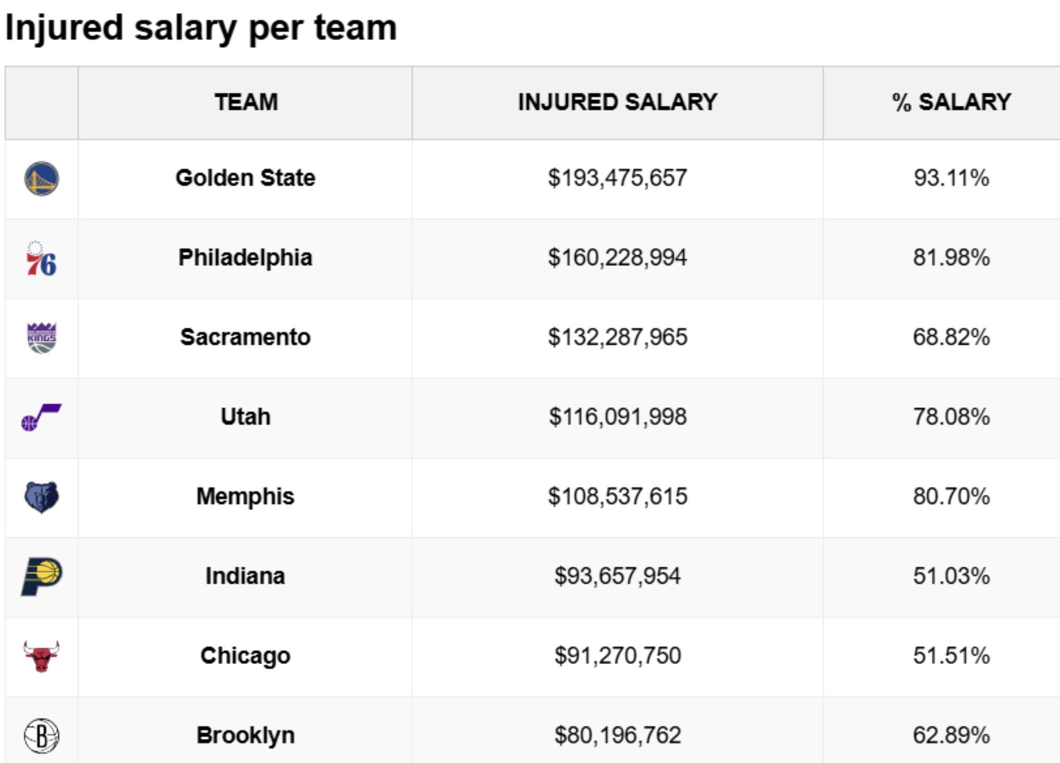 北京时间3月14日,据统计,勇士目前的伤员薪水已经达到了1.93亿美元,占全队工资的93.11%,两个数字都是高居联盟第一。昨日对森林狼的比赛中,勇士队小库里、霍福德和波斯特遭遇伤病,而库里、巴特勒、穆迪等人也已经长期缺席比赛。各队伤病球员薪资金州勇士:伤病薪资 $193475657,占总薪资比例 93.11%费城76人:伤病薪资 $160228994,占总...