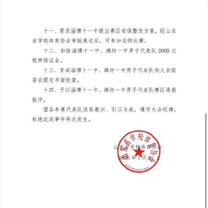 山东省学校体育协会关于对2025-26耐克中国高中篮球联赛(山东赛区)男子组淄博十一中VS潍坊一中代表队的处罚通告,具体如下: