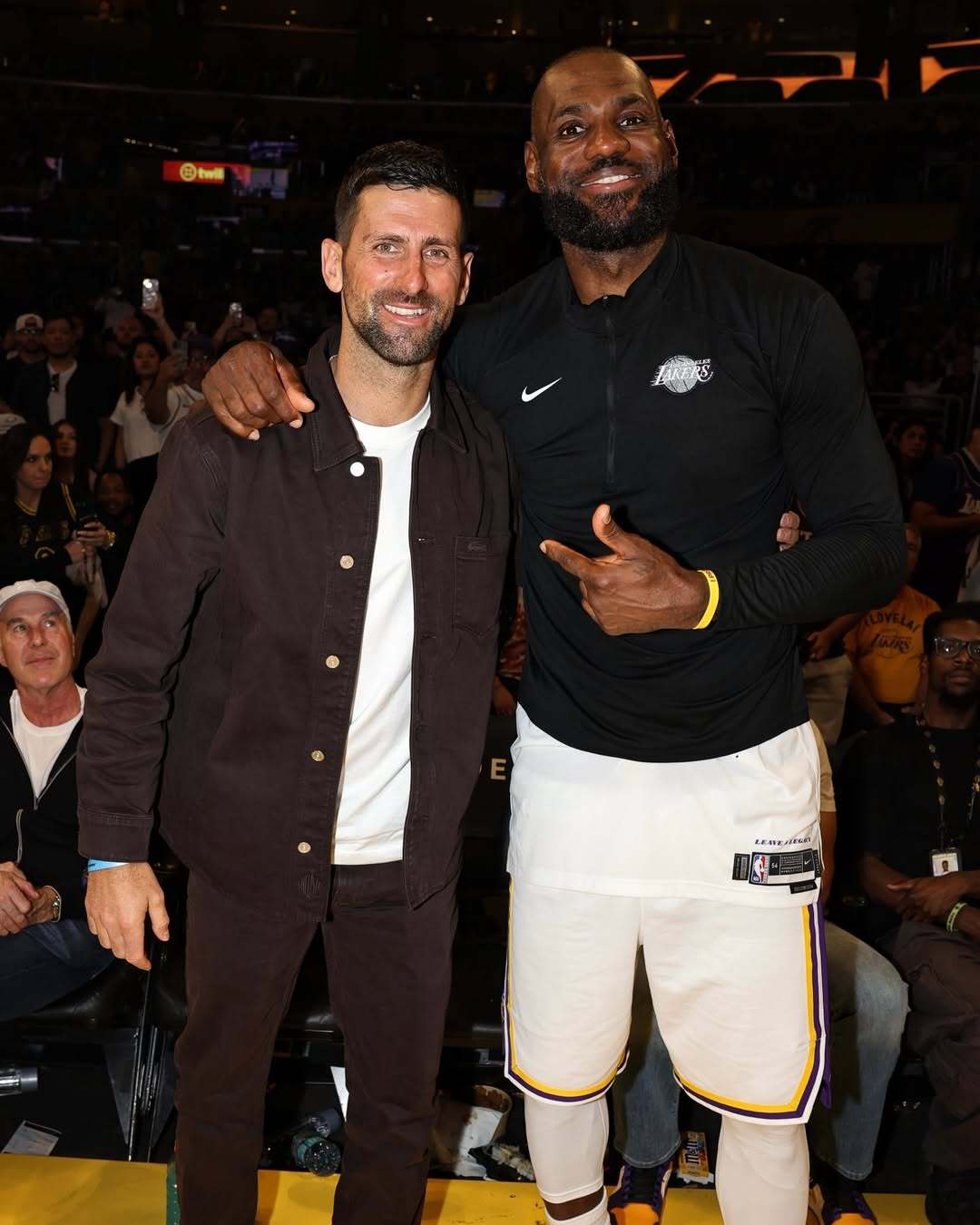 赛后,湖人主场出现了一个历史第一人,来自网球,那就是德约科维奇。德约科维奇在场边看球,赛后跟东契奇碰面,同时还跟篮球历史第一人詹姆斯进行一场GOAT之间的拥抱。